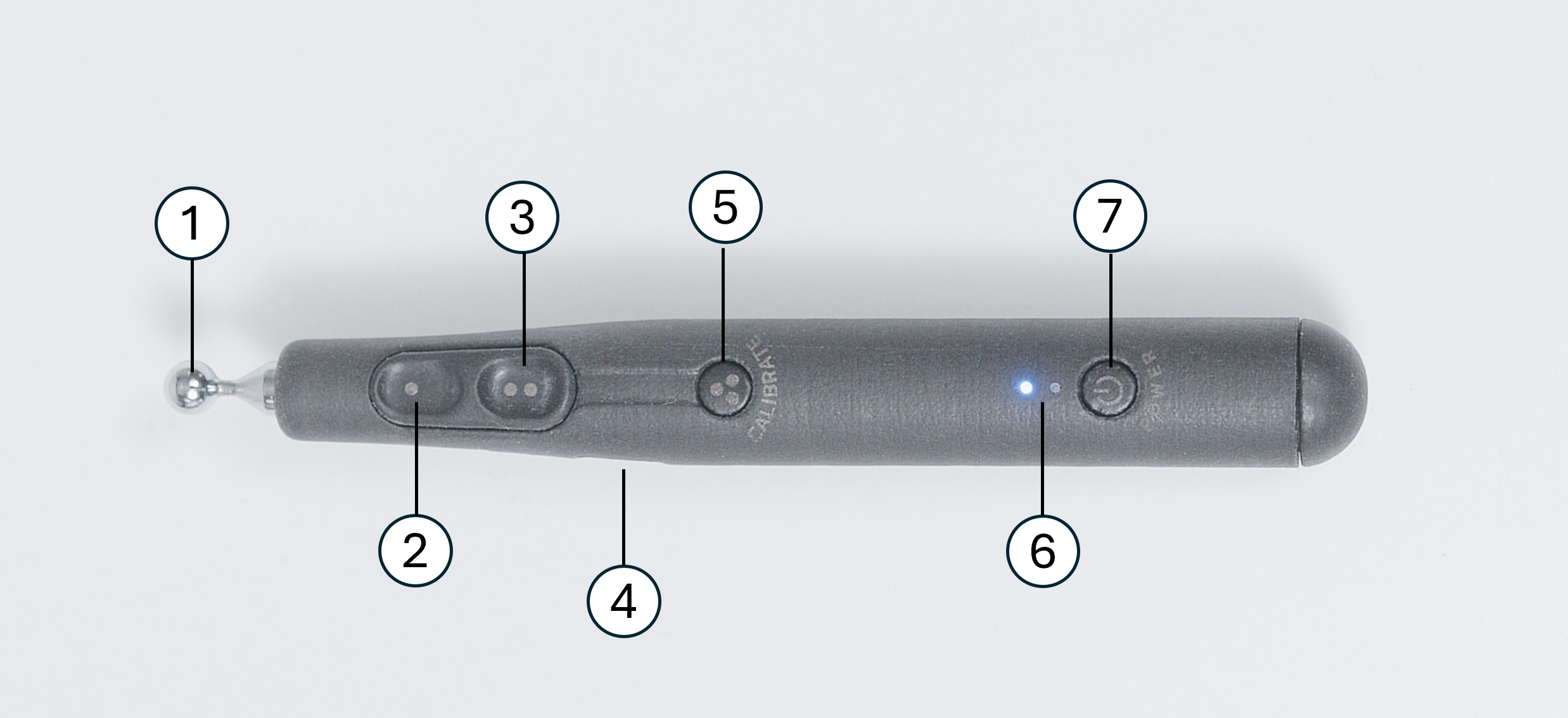 The VerseGrip Stylus has seven main features on the outside: (1) The ball connector which fits into the Inverse3 gimbal, (2) and (3) Input buttons, (4) USB-C charging port, (5) Calibration button, (6) Status LEDs, and (7) A power button.